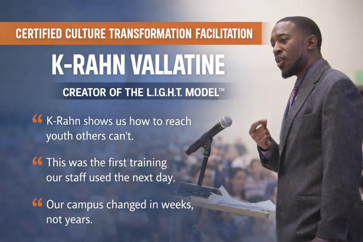 In this short message From Founder, K-Rahn Vallatine, you’ll learn why most systems don’t fail from lack of training—they fail from lack of transformation—and how the L.I.G.H.T. Model™ installs culture from the inside out.