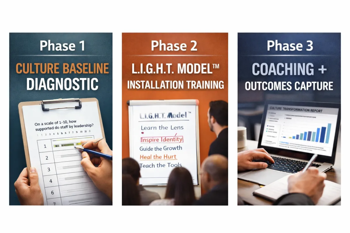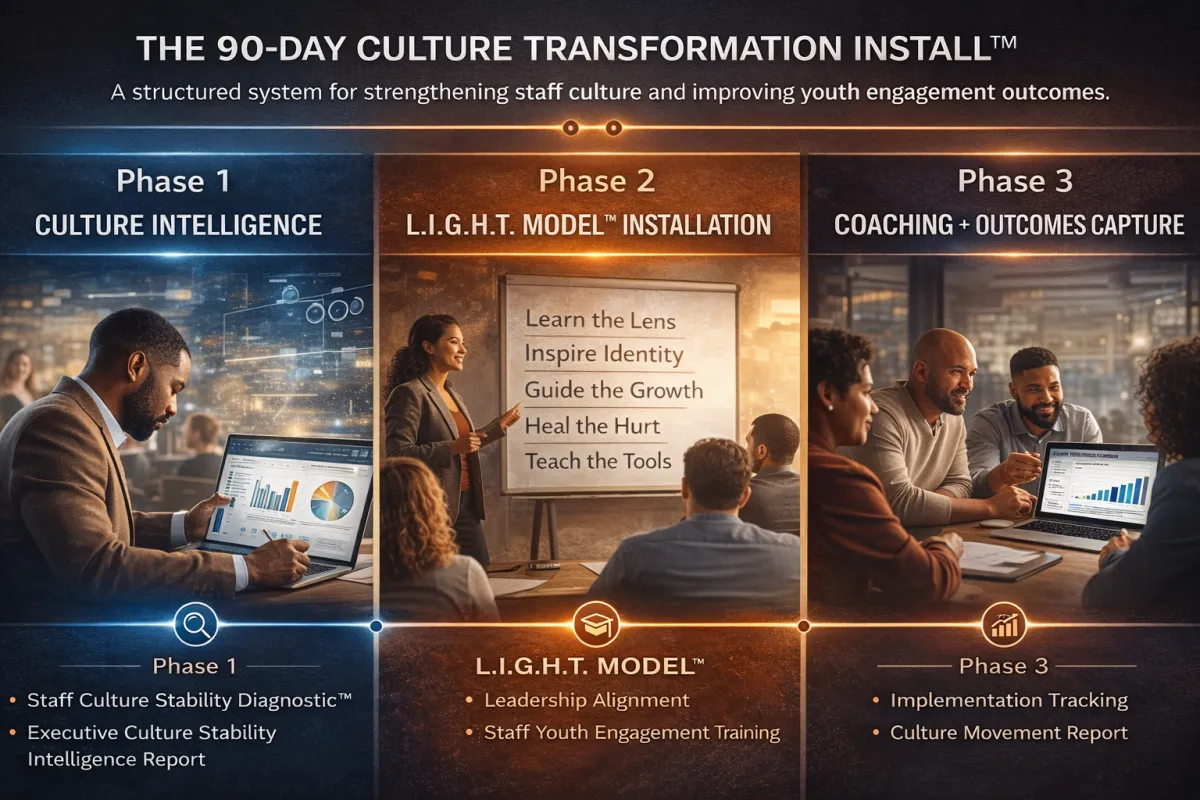 The L.I.G.H.T. Model™ is a trauma-informed, identity-centered culture operating system designed for professionals working in high-pressure youth environments.